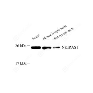 WB检测NKIRAS1蛋白(货号 GB112500). 样品: 经RIPA裂解液(货号G2002)处理的蛋白质. 封闭: 封闭: 3%脱脂牛奶(货号GC310001)溶于TBST溶液, 室温孵育1小时. —抗: 1: 300稀释, 4℃ 孵育过夜. 二抗: HRP标记山羊抗兔IgG (H+L) (货号GB23303), 1: 5000稀释, 室温孵育1小时. |