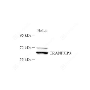 WB检测TRAF3IP3蛋白(货号 GB112228). 样品: 经RIPA裂解液(货号G2002)处理的蛋白质. 封闭: 封闭: 3%脱脂牛奶(货号GC310001)溶于TBST溶液, 室温孵育1小时. —抗: 1: 600稀释, 4℃ 孵育过夜. 二抗: HRP标记山羊抗兔IgG (H+L) (货号GB23303), 1: 5000稀释, 室温孵育1小时. |