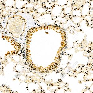 IHC检测Notch3蛋白(货号 GB112035). 样品: 小鼠肺, 4%多聚甲醛 (货号G1101) 固定12-24小时. 抗原修复: 柠檬酸抗原修复液(干粉, pH 6.0) (G1201), 98℃, 20分钟. —抗: 1: 700稀释, 4℃ 孵育过夜. 二抗: HRP标记山羊抗兔IgG (H+L) (货号GB23303), 1: 200稀释, 室温孵育1小时. |