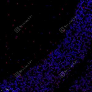 IF检测Notch3蛋白(货号 GB112035)(红色). 样品: 小鼠小脑, 4%多聚甲醛 (货号G1101) 固定12-24小时. 抗原修复: Tris-EDTA抗原修复液(pH 9.0) (G1203), 98℃, 20分钟. 封闭: 3% BSA(货号GC305010)的PBS溶液, 室温孵育30分钟. —抗: 1: 650稀释, 4℃ 孵育过夜. 二抗: Cy3标记山羊抗兔IgG (H+L) (货号GB21303), 1: 300稀释, 室温孵育1小时. |