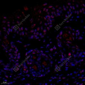 IF检测Notch3蛋白(货号 GB112035)(红色). 样品: 小鼠皮肤, 4%多聚甲醛 (货号G1101) 固定12-24小时. 抗原修复: Tris-EDTA抗原修复液(pH 9.0) (G1203), 98℃, 20分钟. 封闭: 3% BSA(货号GC305010)的PBS溶液, 室温孵育30分钟. —抗: 1: 650稀释, 4℃ 孵育过夜. 二抗: Cy3标记山羊抗兔IgG (H+L) (货号GB21303), 1: 300稀释, 室温孵育1小时. |