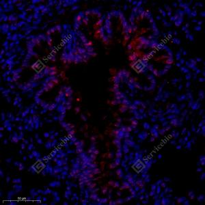 IF检测Notch3蛋白(货号 GB112035)(红色). 样品: 大鼠肺, 4%多聚甲醛 (货号G1101) 固定12-24小时. 抗原修复: Tris-EDTA抗原修复液(pH 9.0) (G1203), 98℃, 20分钟. 封闭: 3% BSA(货号GC305010)的PBS溶液, 室温孵育30分钟. —抗: 1: 650稀释, 4℃ 孵育过夜. 二抗: Cy3标记山羊抗兔IgG (H+L) (货号GB21303), 1: 300稀释, 室温孵育1小时. |