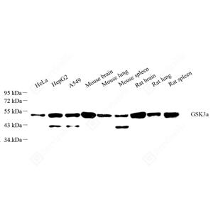 WB检测GSK3 alpha蛋白(货号 GB11605). 样品: 经RIPA裂解液(货号G2002)处理的蛋白质. 封闭: 封闭: 3%脱脂牛奶(货号GC310001)溶于TBST溶液, 室温孵育1小时. —抗: 1: 500稀释, 4℃ 孵育过夜. 二抗: HRP标记山羊抗兔IgG (H+L) (货号GB23303), 1: 5000稀释, 室温孵育1小时. |