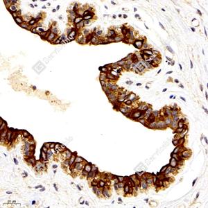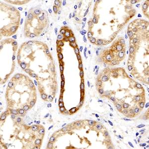 IHC检测PERK蛋白(货号 GB11507). 样品: 人肾, 4%多聚甲醛 (货号G1101) 固定12-24小时. 抗原修复: 柠檬酸抗原修复液(干粉, pH 6.0) (G1201), 98℃, 20分钟. —抗: 1: 1500稀释, 4℃ 孵育过夜. 二抗: HRP标记山羊抗兔IgG (H+L) (货号GB23303), 1: 200稀释, 室温孵育1小时. |