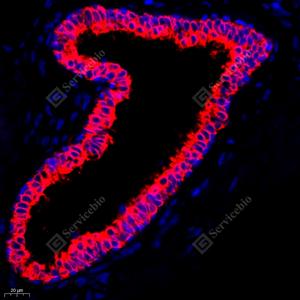 IF检测PERK蛋白(货号 GB11507)(红色). 样品: 人乳腺癌, 4%多聚甲醛 (货号G1101) 固定12-24小时. 抗原修复: Tris-EDTA抗原修复液(pH 9.0) (G1203), 98℃, 20分钟. 封闭: 3% BSA(货号GC305010)的PBS溶液, 室温孵育30分钟. —抗: 1: 1500稀释, 4℃ 孵育过夜. 二抗: Cy3标记山羊抗兔IgG (H+L) (货号GB21303), 1: 300稀释, 室温孵育1小时. |