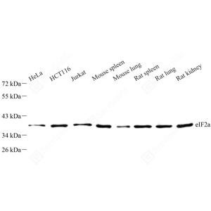 WB检测EIF2S1蛋白(货号 GB11544). 样品: 经RIPA裂解液(货号G2002)处理的蛋白质. 封闭: 3%脱脂牛奶(货号GC310001)溶于TBST溶液, 室温孵育1小时. —抗: 1: 1000稀释, 4℃ 孵育过夜. 二抗: HRP标记山羊抗兔IgG (H+L) (货号GB23303), 1: 5000稀释, 室温孵育1小时. |