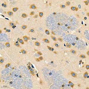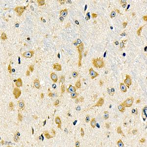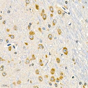 IHC检测EIF2S1蛋白(货号 GB11544). 样品: 小鼠脑, 4%多聚甲醛 (货号G1101) 固定12-24小时. 抗原修复: 柠檬酸抗原修复液(干粉, pH 6.0) (G1201), 98℃, 20分钟. —抗: 1: 1500稀释, 4℃ 孵育过夜. 二抗: HRP标记山羊抗兔IgG (H+L) (货号GB23303), 1: 200稀释, 室温孵育1小时. |
