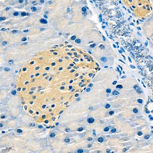 IHC检测EIF2S1蛋白(货号 GB11544). 样品: 小鼠胰腺, 4%多聚甲醛 (货号G1101) 固定12-24小时. 抗原修复: 柠檬酸抗原修复液(干粉, pH 6.0) (G1201), 98℃, 20分钟. —抗: 1: 800稀释, 4℃ 孵育过夜. 二抗: HRP标记山羊抗兔IgG (H+L) (货号GB23303), 1: 200稀释, 室温孵育1小时. |