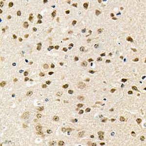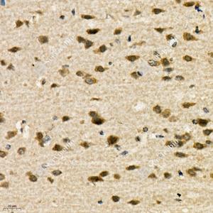 IHC检测eIF4E蛋白(货号 GB11565). 样品: 大鼠脑, 4%多聚甲醛 (货号G1101) 固定12-24小时. 抗原修复: Tris-EDTA抗原修复液(pH 9.0) (G1203), 98℃, 20分钟. —抗: 1: 2000稀释, 4℃ 孵育过夜. 二抗: HRP标记山羊抗兔IgG (H+L) (货号GB23303), 1: 200稀释, 室温孵育1小时. |