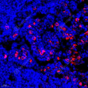IF检测eIF4E蛋白(货号 GB11565)(红色). 样品: 小鼠淋巴结, 4%多聚甲醛 (货号G1101) 固定12-24小时. 抗原修复: Tris-EDTA抗原修复液(pH 9.0) (G1203), 98℃, 20分钟. 封闭: 3% BSA(货号GC305010)的PBS溶液, 室温孵育30分钟. —抗: 1: 1000稀释, 4℃ 孵育过夜. 二抗: Cy3标记山羊抗兔IgG (H+L) (货号GB21303), 1: 300稀释, 室温孵育1小时. |