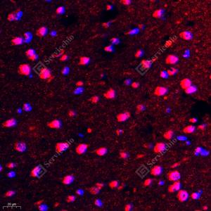 IF检测eIF4E蛋白(货号 GB11565)(红色). 样品: 大鼠脑, 4%多聚甲醛 (货号G1101) 固定12-24小时. 抗原修复: Tris-EDTA抗原修复液(pH 9.0) (G1203), 98℃, 20分钟. 封闭: 3% BSA(货号GC305010)的PBS溶液, 室温孵育30分钟. —抗: 1: 1000稀释, 4℃ 孵育过夜. 二抗: Cy3标记山羊抗兔IgG (H+L) (货号GB21303), 1: 300稀释, 室温孵育1小时. |