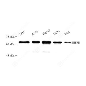 WB检测EIF3D蛋白(货号 GB111544). 样品: 经RIPA裂解液(货号G2002)处理的蛋白质. 封闭: 封闭: 3%脱脂牛奶(货号GC310001)溶于TBST溶液, 室温孵育1小时. —抗: 1: 500稀释, 4℃ 孵育过夜. 二抗: HRP标记山羊抗兔IgG (H+L) (货号GB23303), 1: 5000稀释, 室温孵育1小时. |