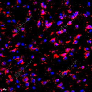 | IF检测eIF5A2蛋白(货号 GB111983)(红色). 样品: 小鼠脑, 4%多聚甲醛 (货号G1101) 固定12-24小时. 抗原修复: Tris-EDTA抗原修复液(pH 9.0) (G1203), 98℃, 20分钟. 封闭: 3% BSA(货号GC305010)的PBS溶液, 室温孵育30分钟. —抗: 1: 300稀释, 4℃ 孵育过夜. 二抗: Cy3标记山羊抗兔IgG (H+L) (货号GB21303), 1: 300稀释, 室温孵育1小时. |