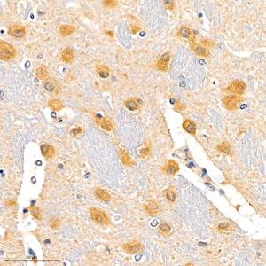 IHC检测eRF1蛋白(货号 GB111098). 样品: 大鼠脑, 4%多聚甲醛 (货号G1101) 固定12-24小时. 抗原修复: 柠檬酸抗原修复液(干粉, pH 6.0) (G1201), 98℃, 20分钟. —抗: 1: 2400稀释, 4℃ 孵育过夜. 二抗: HRP标记山羊抗兔IgG (H+L) (货号GB23303), 1: 200稀释, 室温孵育1小时. |
