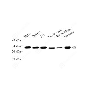 WB检测eIF-6蛋白(货号 GB111101). 样品: 经RIPA裂解液(货号G2002)处理的蛋白质. 封闭: 封闭: 3%脱脂牛奶(货号GC310001)溶于TBST溶液, 室温孵育1小时. —抗: 1: 1000稀释, 4℃ 孵育过夜. 二抗: HRP标记山羊抗兔IgG (H+L) (货号GB23303), 1: 5000稀释, 室温孵育1小时. |