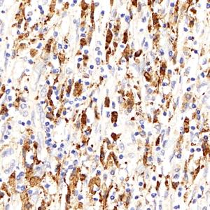 IHC检测eIF2B3蛋白(货号 GB114048). 样品: 人肾癌, 4%多聚甲醛 (货号G1101) 固定12-24小时. 抗原修复: 柠檬酸抗原修复液(干粉, pH 6.0) (G1201), 98℃, 20分钟. —抗: 1: 1500稀释, 4℃ 孵育过夜. 二抗: HRP标记山羊抗兔IgG (H+L) (货号GB23303), 1: 200稀释, 室温孵育1小时. |