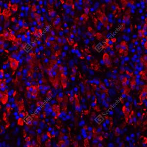 IF检测eIF2B3蛋白(货号 GB114048)(红色). 样品: 人肝癌, 4%多聚甲醛 (货号G1101) 固定12-24小时. 抗原修复: Tris-EDTA抗原修复液(pH 9.0) (G1203), 98℃, 20分钟. 封闭: 3% BSA(货号GC305010)的PBS溶液, 室温孵育30分钟. —抗: 1: 1000稀释, 4℃ 孵育过夜. 二抗: Cy3标记山羊抗兔IgG (H+L) (货号GB21303), 1: 300稀释, 室温孵育1小时. |