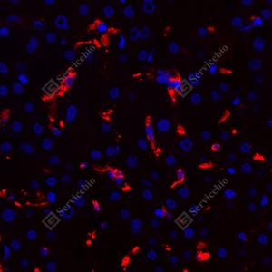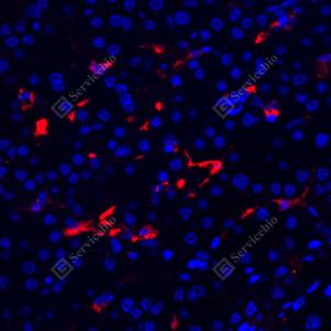 IF检测eIF2B3蛋白(货号 GB114048)(红色). 样品: 人肝, 4%多聚甲醛 (货号G1101) 固定12-24小时. 抗原修复: Tris-EDTA抗原修复液(pH 9.0) (G1203), 98℃, 20分钟. 封闭: 3% BSA(货号GC305010)的PBS溶液, 室温孵育30分钟. —抗: 1: 1000稀释, 4℃ 孵育过夜. 二抗: Cy3标记山羊抗兔IgG (H+L) (货号GB21303), 1: 300稀释, 室温孵育1小时. |