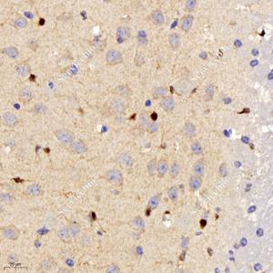 | IHC检测EIF5蛋白(货号 GB11656). 样品: 小鼠脑, 4%多聚甲醛 (货号G1101) 固定12-24小时. 抗原修复: 柠檬酸抗原修复液(干粉, pH 6.0) (G1201), 98℃, 20分钟. —抗: 1: 1500稀释, 4℃ 孵育过夜. 二抗: HRP标记山羊抗兔IgG (H+L) (货号GB23303), 1: 200稀释, 室温孵育1小时. |
