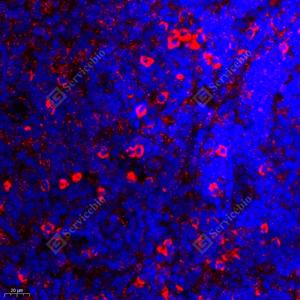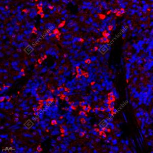 IF检测EIF5蛋白(货号 GB11655)(红色). 样品: 小鼠淋巴结, 4%多聚甲醛 (货号G1101) 固定12-24小时. 抗原修复: Tris-EDTA抗原修复液(pH 9.0) (G1203), 98℃, 20分钟. 封闭: 3% BSA(货号GC305010)的PBS溶液, 室温孵育30分钟. —抗: 1: 2000稀释, 4℃ 孵育过夜. 二抗: Cy3标记山羊抗兔IgG (H+L) (货号GB21303), 1: 300稀释, 室温孵育1小时. |