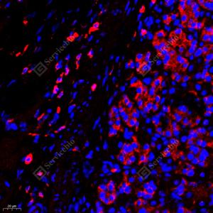 IF检测EIF5蛋白(货号 GB11655)(红色). 样品: 大鼠脾, 4%多聚甲醛 (货号G1101) 固定12-24小时. 抗原修复: Tris-EDTA抗原修复液(pH 9.0) (G1203), 98℃, 20分钟. 封闭: 3% BSA(货号GC305010)的PBS溶液, 室温孵育30分钟. —抗: 1: 2000稀释, 4℃ 孵育过夜. 二抗: Cy3标记山羊抗兔IgG (H+L) (货号GB21303), 1: 300稀释, 室温孵育1小时. |