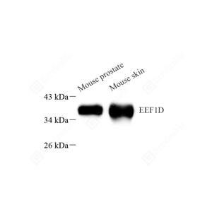 EEF1D, also named as EF1D and EF 1 delta, belongs to the EF-1-beta/EF-1-delta family. It is a subunit of the elongation factor-1 complex, which is responsible for the enzymatic delivery of aminoacyl tRNAs to the ribosome. EF-1-beta and EF-1-delta stimulate the exchange of GDP bound to EF-1-alpha to GTP. EEF1D is phosphorylated upon DNA damage, probably by ATM or ATR. The calculated molecular weight of EEF1D is a 31 kDa, but the modified protein is about 35-40 kDa.