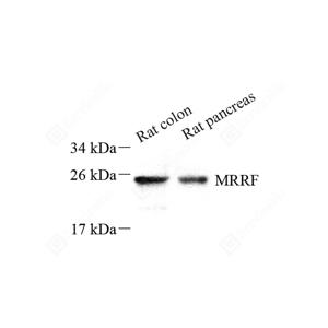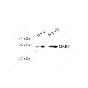 WB检测MRRF蛋白(货号 GB111812). 样品: 经RIPA裂解液(货号G2002)处理的蛋白质. 封闭: 封闭: 3%脱脂牛奶(货号GC310001)溶于TBST溶液, 室温孵育1小时. —抗: 1: 1000稀释, 4℃ 孵育过夜. 二抗: HRP标记山羊抗兔IgG (H+L) (货号GB23303), 1: 5000稀释, 室温孵育1小时. |