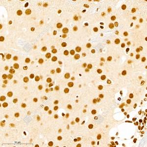 IHC检测CTCF蛋白(货号 GB111225). 样品: 小鼠脑, 4%多聚甲醛 (货号G1101) 固定12-24小时. 抗原修复: Tris-EDTA抗原修复液(pH 9.0) (G1203), 98℃, 20分钟. —抗: 1: 1000稀释, 4℃ 孵育过夜. 二抗: HRP标记山羊抗兔IgG (H+L) (货号GB23303), 1: 200稀释, 室温孵育1小时. |