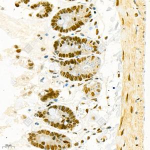 IHC检测CTCF蛋白(货号 GB111225). 样品: 小鼠结肠, 4%多聚甲醛 (货号G1101) 固定12-24小时. 抗原修复: Tris-EDTA抗原修复液(pH 9.0) (G1203), 98℃, 20分钟. —抗: 1: 1000稀释, 4℃ 孵育过夜. 二抗: HRP标记山羊抗兔IgG (H+L) (货号GB23303), 1: 200稀释, 室温孵育1小时. |