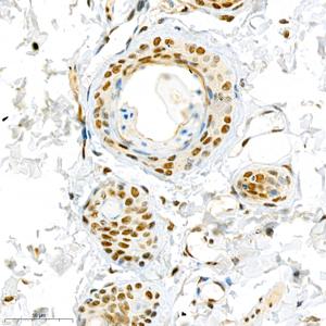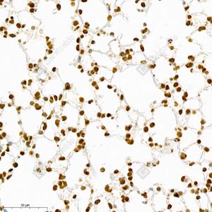 IHC检测CTCF蛋白(货号 GB111225). 样品: 小鼠肺, 4%多聚甲醛 (货号G1101) 固定12-24小时. 抗原修复: Tris-EDTA抗原修复液(pH 9.0) (G1203), 98℃, 20分钟. —抗: 1: 1000稀释, 4℃ 孵育过夜. 二抗: HRP标记山羊抗兔IgG (H+L) (货号GB23303), 1: 200稀释, 室温孵育1小时. |