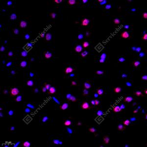 IF检测CTCF蛋白(货号 GB111225)(红色). 样品: 小鼠脑, 4%多聚甲醛 (货号G1101) 固定12-24小时. 抗原修复: Tris-EDTA抗原修复液(pH 9.0) (G1203), 98℃, 20分钟. 封闭: 3% BSA(货号GC305010)的PBS溶液, 室温孵育30分钟. —抗: 1: 500稀释, 4℃ 孵育过夜. 二抗: Cy3标记山羊抗兔IgG (H+L) (货号GB21303), 1: 300稀释, 室温孵育1小时. |