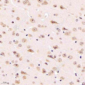IHC检测DDX5蛋白(货号 GB112552). 样品: 小鼠脑, 4%多聚甲醛 (货号G1101) 固定12-24小时. 抗原修复: 柠檬酸抗原修复液(干粉, pH 6.0) (G1201), 98℃, 20分钟. —抗: 1: 700稀释, 4℃ 孵育过夜. 二抗: HRP标记山羊抗兔IgG (H+L) (货号GB23303), 1: 200稀释, 室温孵育1小时. |