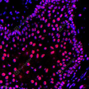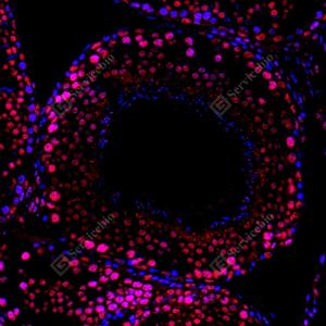 IF检测DDX5蛋白(货号 GB112552)(红色). 样品: 大鼠睾丸, 4%多聚甲醛 (货号G1101) 固定12-24小时. 抗原修复: Tris-EDTA抗原修复液(pH 9.0) (G1203), 98℃, 20分钟. 封闭: 3% BSA(货号GC305010)的PBS溶液, 室温孵育30分钟. —抗: 1: 700稀释, 4℃ 孵育过夜. 二抗: Cy3标记山羊抗兔IgG (H+L) (货号GB21303), 1: 300稀释, 室温孵育1小时. |