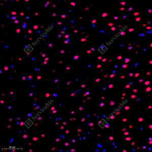 IF检测DDX5蛋白(货号 GB112552)(红色). 样品: 大鼠脑, 4%多聚甲醛 (货号G1101) 固定12-24小时. 抗原修复: Tris-EDTA抗原修复液(pH 9.0) (G1203), 98℃, 20分钟. 封闭: 3% BSA(货号GC305010)的PBS溶液, 室温孵育30分钟. —抗: 1: 700稀释, 4℃ 孵育过夜. 二抗: Cy3标记山羊抗兔IgG (H+L) (货号GB21303), 1: 300稀释, 室温孵育1小时. |