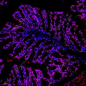 IF检测DDX5蛋白(货号 GB112552)(红色). 样品: 小鼠结肠, 4%多聚甲醛 (货号G1101) 固定12-24小时. 抗原修复: Tris-EDTA抗原修复液(pH 9.0) (G1203), 98℃, 20分钟. 封闭: 3% BSA(货号GC305010)的PBS溶液, 室温孵育30分钟. —抗: 1: 700稀释, 4℃ 孵育过夜. 二抗: Cy3标记山羊抗兔IgG (H+L) (货号GB21303), 1: 300稀释, 室温孵育1小时. |
