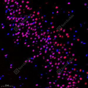 IF检测DDX5蛋白(货号 GB112552)(红色). 样品: 大鼠乳腺, 4%多聚甲醛 (货号G1101) 固定12-24小时. 抗原修复: Tris-EDTA抗原修复液(pH 9.0) (G1203), 98℃, 20分钟. 封闭: 3% BSA(货号GC305010)的PBS溶液, 室温孵育30分钟. —抗: 1: 700稀释, 4℃ 孵育过夜. 二抗: Cy3标记山羊抗兔IgG (H+L) (货号GB21303), 1: 300稀释, 室温孵育1小时. |