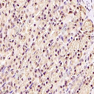 IHC检测DDX19B蛋白(货号 GB112551). 样品: 人胃癌, 4%多聚甲醛 (货号G1101) 固定12-24小时. 抗原修复: 柠檬酸抗原修复液(干粉, pH 6.0) (G1201), 98℃, 20分钟. —抗: 1: 1000稀释, 4℃ 孵育过夜. 二抗: HRP标记山羊抗兔IgG (H+L) (货号GB23303), 1: 200稀释, 室温孵育1小时. |