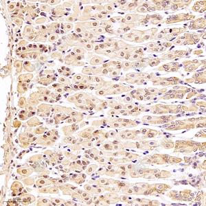 IHC检测DDX19B蛋白(货号 GB112551). 样品: 小鼠心, 4%多聚甲醛 (货号G1101) 固定12-24小时. 抗原修复: 柠檬酸抗原修复液(干粉, pH 6.0) (G1201), 98℃, 20分钟. —抗: 1: 1000稀释, 4℃ 孵育过夜. 二抗: HRP标记山羊抗兔IgG (H+L) (货号GB23303), 1: 200稀释, 室温孵育1小时. |