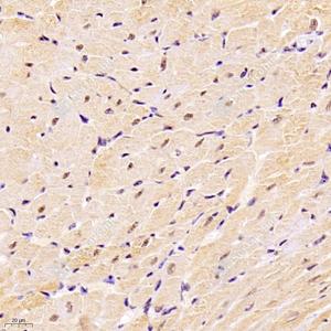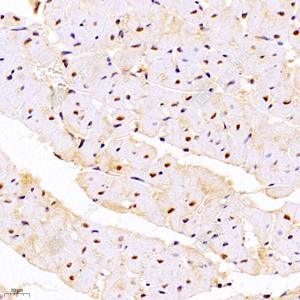 IHC检测DDX19B蛋白(货号 GB112551). 样品: 大鼠心, 4%多聚甲醛 (货号G1101) 固定12-24小时. 抗原修复: 柠檬酸抗原修复液(干粉, pH 6.0) (G1201), 98℃, 20分钟. —抗: 1: 1000稀释, 4℃ 孵育过夜. 二抗: HRP标记山羊抗兔IgG (H+L) (货号GB23303), 1: 200稀释, 室温孵育1小时. |