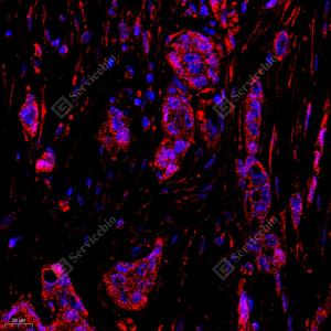 IF检测DDX19B蛋白(货号 GB112551)(红色). 样品: 人乳腺癌, 4%多聚甲醛 (货号G1101) 固定12-24小时. 抗原修复: Tris-EDTA抗原修复液(pH 9.0) (G1203), 98℃, 20分钟. 封闭: 3% BSA(货号GC305010)的PBS溶液, 室温孵育30分钟. —抗: 1: 650稀释, 4℃ 孵育过夜. 二抗: Cy3标记山羊抗兔IgG (H+L) (货号GB21303), 1: 300稀释, 室温孵育1小时. |