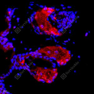 IF检测DDX19B蛋白(货号 GB112551)(红色). 样品: 大鼠乳腺, 4%多聚甲醛 (货号G1101) 固定12-24小时. 抗原修复: Tris-EDTA抗原修复液(pH 9.0) (G1203), 98℃, 20分钟. 封闭: 3% BSA(货号GC305010)的PBS溶液, 室温孵育30分钟. —抗: 1: 650稀释, 4℃ 孵育过夜. 二抗: Cy3标记山羊抗兔IgG (H+L) (货号GB21303), 1: 300稀释, 室温孵育1小时. |