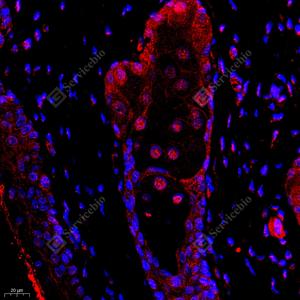 IF检测DDX19B蛋白(货号 GB112551)(红色). 样品: 小鼠乳腺, 4%多聚甲醛 (货号G1101) 固定12-24小时. 抗原修复: Tris-EDTA抗原修复液(pH 9.0) (G1203), 98℃, 20分钟. 封闭: 3% BSA(货号GC305010)的PBS溶液, 室温孵育30分钟. —抗: 1: 650稀释, 4℃ 孵育过夜. 二抗: Cy3标记山羊抗兔IgG (H+L) (货号GB21303), 1: 300稀释, 室温孵育1小时. |