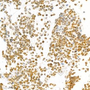 | IHC检测ID1蛋白(货号 GB111182). 样品: 大鼠淋巴, 4%多聚甲醛 (货号G1101) 固定12-24小时. 抗原修复: 柠檬酸抗原修复液(干粉, pH 6.0) (G1201), 98℃, 20分钟. —抗: 1: 800稀释, 4℃ 孵育过夜. 二抗: HRP标记山羊抗兔IgG (H+L) (货号GB23303), 1: 200稀释, 室温孵育1小时. |