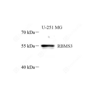 WB检测RBMS3蛋白(货号 GB115105). 样品: 经RIPA裂解液(货号G2002)处理的蛋白质. 封闭: 封闭: 3%脱脂牛奶(货号GC310001)溶于TBST溶液, 室温孵育1小时. —抗: 1: 800稀释, 4℃ 孵育过夜. 二抗: HRP标记山羊抗兔IgG (H+L) (货号GB23303), 1: 5000稀释, 室温孵育1小时. |