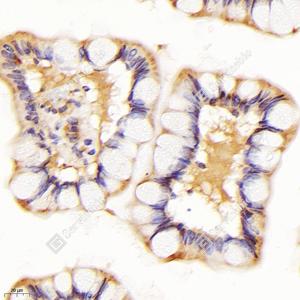 IHC检测NRDP1蛋白(货号 GB114518). 样品: 人结肠, 4%多聚甲醛 (货号G1101) 固定12-24小时. 抗原修复: 柠檬酸抗原修复液(干粉, pH 6.0) (G1201), 98℃, 20分钟. —抗: 1: 1000稀释, 4℃ 孵育过夜. 二抗: HRP标记山羊抗兔IgG (H+L) (货号GB23303), 1: 200稀释, 室温孵育1小时. |