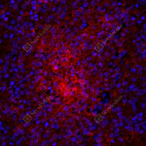 IF检测NRDP1蛋白(货号 GB114518)(红色). 样品: 人卵巢癌, 4%多聚甲醛 (货号G1101) 固定12-24小时. 抗原修复: Tris-EDTA抗原修复液(pH 9.0) (G1203), 98℃, 20分钟. 封闭: 3% BSA(货号GC305010)的PBS溶液, 室温孵育30分钟. —抗: 1: 1000稀释, 4℃ 孵育过夜. 二抗: Cy3标记山羊抗兔IgG (H+L) (货号GB21303), 1: 300稀释, 室温孵育1小时. |