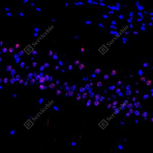 | IF检测RMND5A蛋白(货号 GB112796)(红色). 样品: 小鼠黑质, 4%多聚甲醛 (货号G1101) 固定12-24小时. 抗原修复: Tris-EDTA抗原修复液(pH 9.0) (G1203), 98℃, 20分钟. 封闭: 3% BSA(货号GC305010)的PBS溶液, 室温孵育30分钟. —抗: 1: 600稀释, 4℃ 孵育过夜. 二抗: Cy3标记山羊抗兔IgG (H+L) (货号GB21303), 1: 300稀释, 室温孵育1小时. |