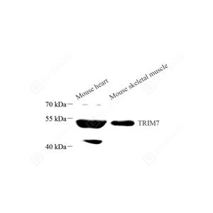 | WB检测TRIM7蛋白(货号 GB114596). 样品: 经RIPA裂解液(货号G2002)处理的蛋白质. 封闭: 封闭: 3%脱脂牛奶(货号GC310001)溶于TBST溶液, 室温孵育1小时. —抗: 1: 800稀释, 4℃ 孵育过夜. 二抗: HRP标记山羊抗兔IgG (H+L) (货号GB23303), 1: 5000稀释, 室温孵育1小时. |