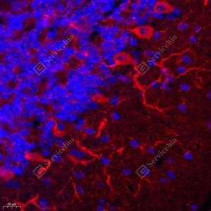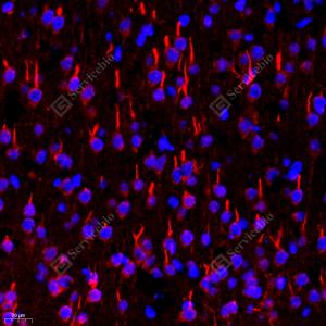 IF检测TRIM46蛋白(货号 GB113864)(红色). 样品: 小鼠脑, 4%多聚甲醛 (货号G1101) 固定12-24小时. 抗原修复: Tris-EDTA抗原修复液(pH 9.0) (G1203), 98℃, 20分钟. 封闭: 3% BSA(货号GC305010)的PBS溶液, 室温孵育30分钟. —抗: 1: 1600稀释, 4℃ 孵育过夜. 二抗: Cy3标记山羊抗兔IgG (H+L) (货号GB21303), 1: 300稀释, 室温孵育1小时. |
