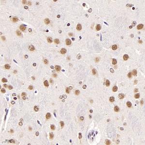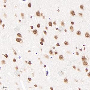IHC检测ATXN7L3蛋白(货号 GB114096). 样品: 小鼠脑, 4%多聚甲醛 (货号G1101) 固定12-24小时. 抗原修复: 柠檬酸抗原修复液(干粉, pH 6.0) (G1201), 98℃, 20分钟. —抗: 1: 750稀释, 4℃ 孵育过夜. 二抗: HRP标记山羊抗兔IgG (H+L) (货号GB23303), 1: 200稀释, 室温孵育1小时. |